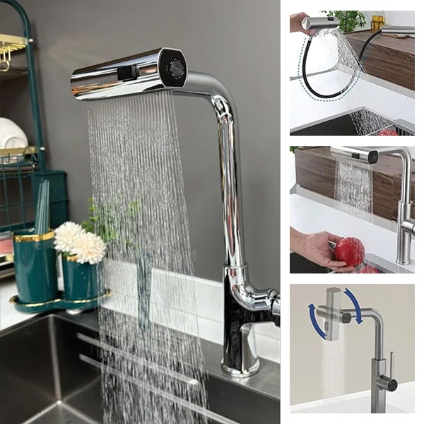 Naša višenamjenska kuhinjska miješalica uključuje visokotlačni izlaz za vodu koji se okreće za 360°, što ne samo da eliminira prskanje, već i poboljšava protok vode, čineći pranje i ispiranje učinkovitijim i jednostavnijim.