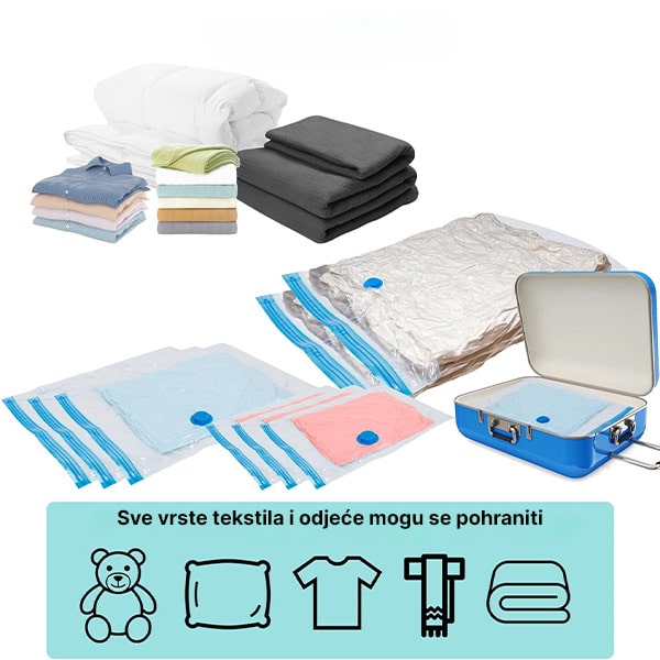 Ponestaje vam prostora za pohranu? Uštedite do 80% prostora s našim vakuumskim vrećama za pohranu! Jednostavno spakirajte – zatvorite – i usisajte zrak kako biste smanjili glomazne predmete poput odjeće, deka i posteljine. Više prostora, manje nereda!